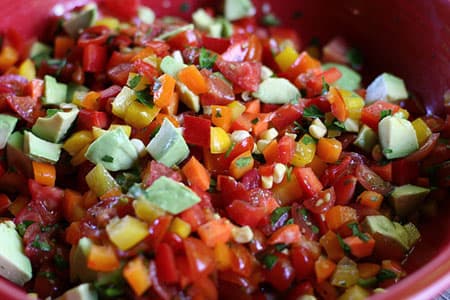 Saltea cebolla picada con pimientos verdes y rojos cortados en cubitos, maíz y jalapeños en rodajas (quita las semillas y nervaduras para que no sea tan picante).