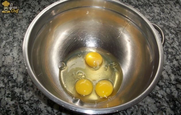 Por otro lado, cascamos los huevos sobre un recipiente y los batimos ligeramente. Opcionalmente, para que la crema quede más sabrosa, podemos reemplazar los 3 huevos por 2 huevos y 2 yemas.