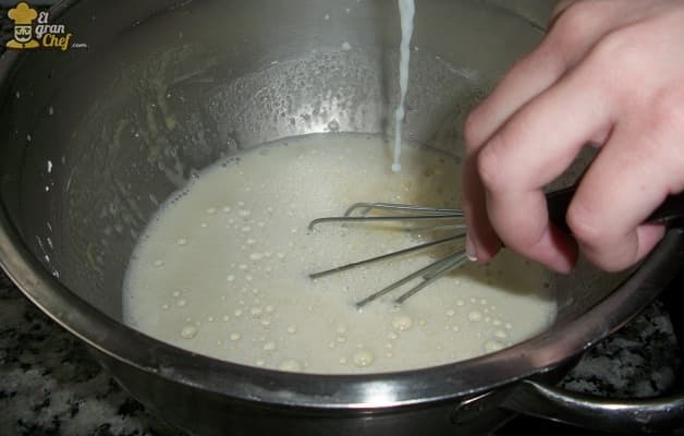 Luego integramos la leche que queda y llevamos toda la mezcla al fuego nuevamente y mezclamos, constantemente para que no se hagan grumos.