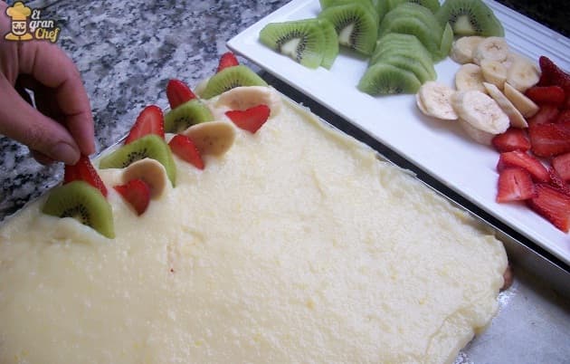 Acomodamos la fruta, pinchándola un poco para que no se mueva. Podemos armar un diseño y repetirlo varias veces, según como lo vayamos a cortar.