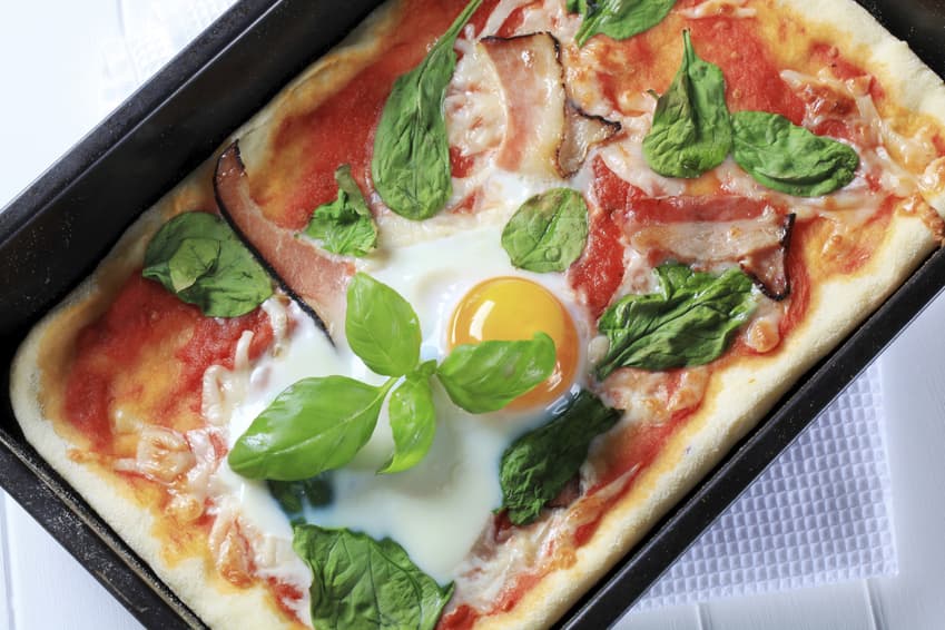 Muy bien, lo admitimos: para comer esta pizza con huevo y tocino tienes que tener un estómago y un hígado fuertes. Pero si los tienes, ¡no dejes de probarla!