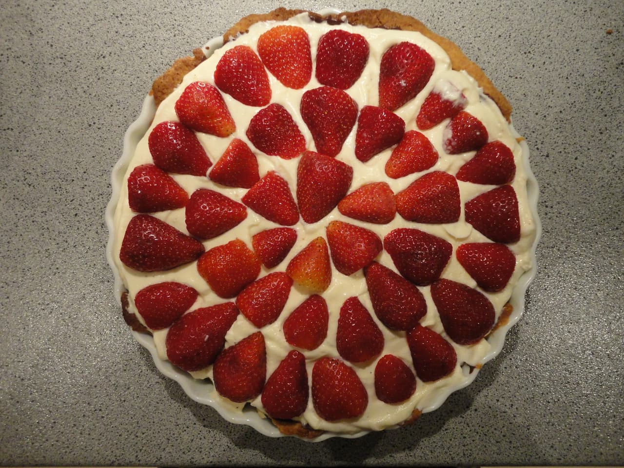 Vuelve a llevar la tarta de fresas al refrigerador y retírala 20 minutos antes de servir.