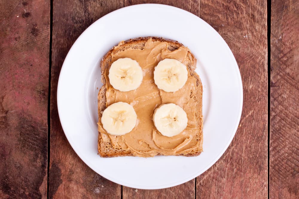 - Tuesta el pan y distribuye ½ cucharada de mantequilla de maní en cada rebanada.