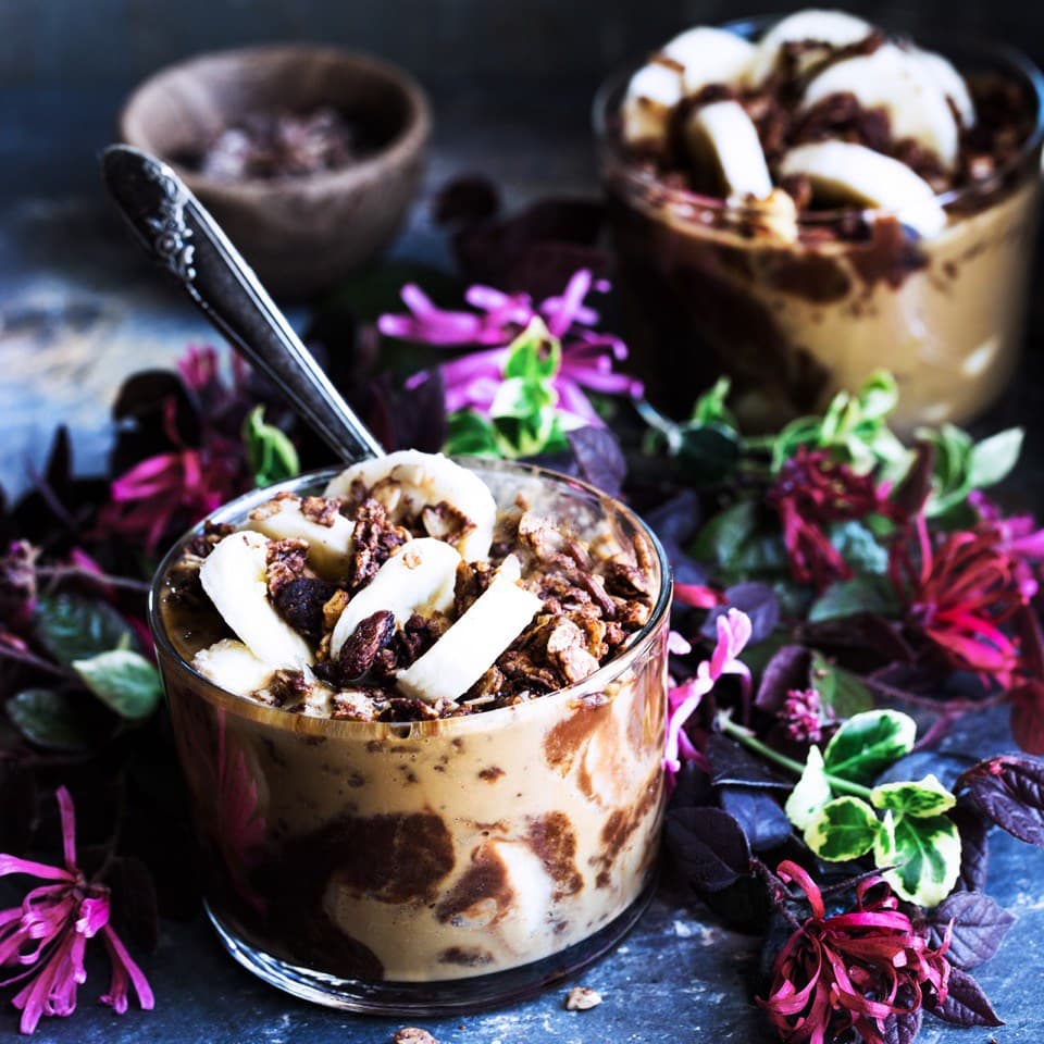Para preparar la salsa solo debes mezclar ¼ de taza de aceite de coco, 2 cucharadas de cacao en polvo, 2 cucharadas de jarabe de arce y 1 cucharadita de extracto de vainilla. Reserva esto para el final, y mantén la salsa a temperatura ambiente.