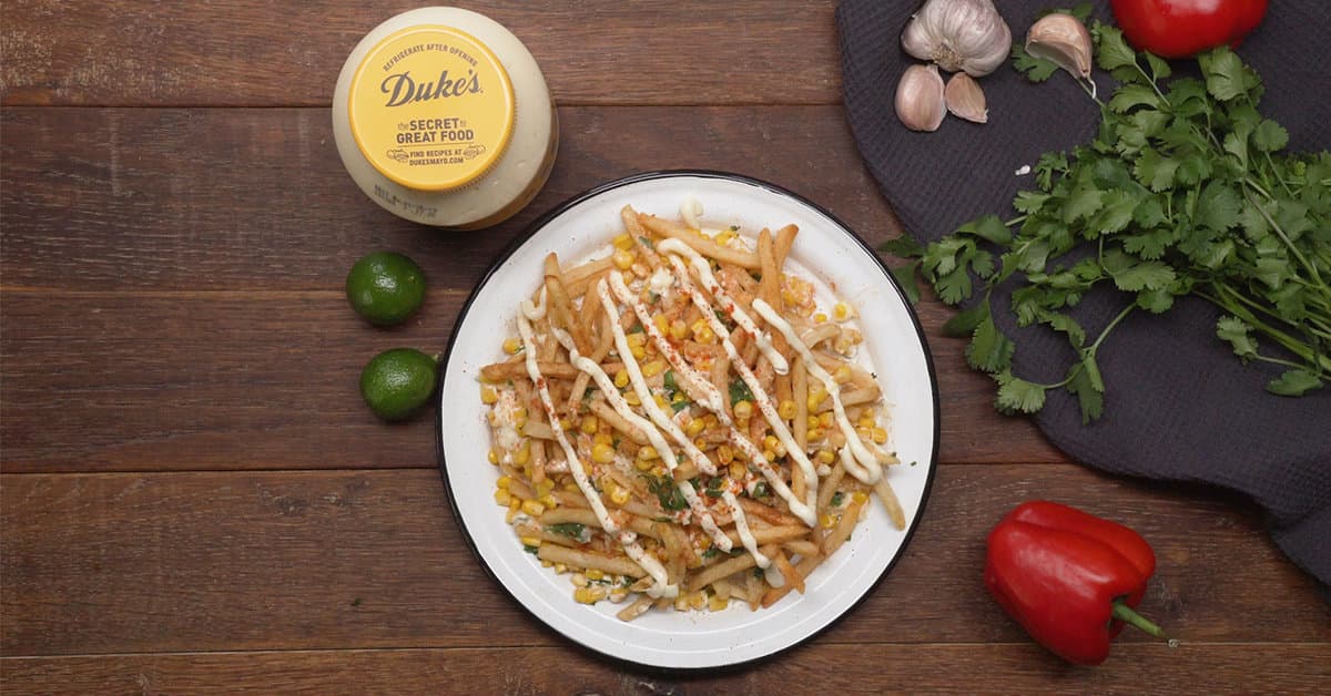 Hornea las papas y colócalas en un plato. Añade sal al gusto, el ajo en polvo, el queso parmesano rallado y los granos de elote. En una bolsa plástica coloca la Mayonesa Duke's, corta una abertura y exprime para esparcir la mayonesa sobre las papas. Añade la pimienta cayena, el cilantro y el chile rojo picado. Exprime un limón y ¡a disfrutar!