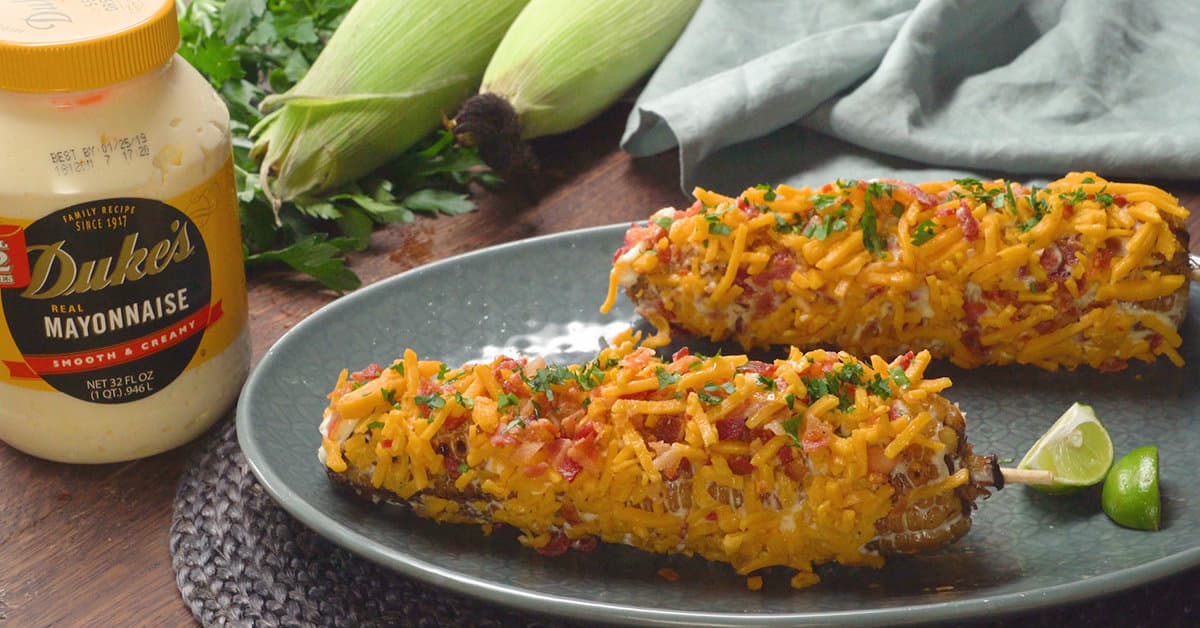 Toma las dos piezas de elote ya limpias y coloca un palito de madera en uno de los lados. Utilizando una brocha de cocina, recubre los elotes con aceite de canola. Coloca los elotes en un sartén de hierro, añade dos cucharadas de agua y cubre con papel de aluminio. Cocina al vapor 20 minutos. Luego destapa el sartén y fríe los elotes hasta asar moviéndolos con frecuencia. Cubre los elotes con Mayonesa Duke's. En un plato coloca el tocino y pasa por él los elotes hasta cubrir. Repite el proceso con el queso cheddar rallado. Añade jugo de limón y perejil picado a tu gusto.