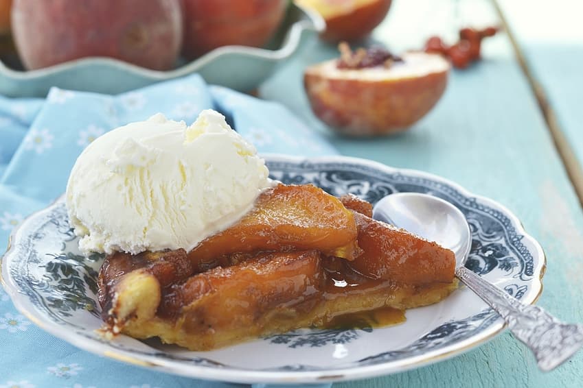 Coloca dos latas de melocotones en almíbar en una bandeja para horno engrasada. Vierte encima el contenido de una caja de pastel de vainilla. Encima de eso coloca 100 gramos de mantequilla en cubos, cubre con papel aluminio y lleva al horno durante 30 minutos. Retira el papel aluminio y cocina unos minutos más hasta que se dore. Puedes servir el postre de melocotón solo o con helado.