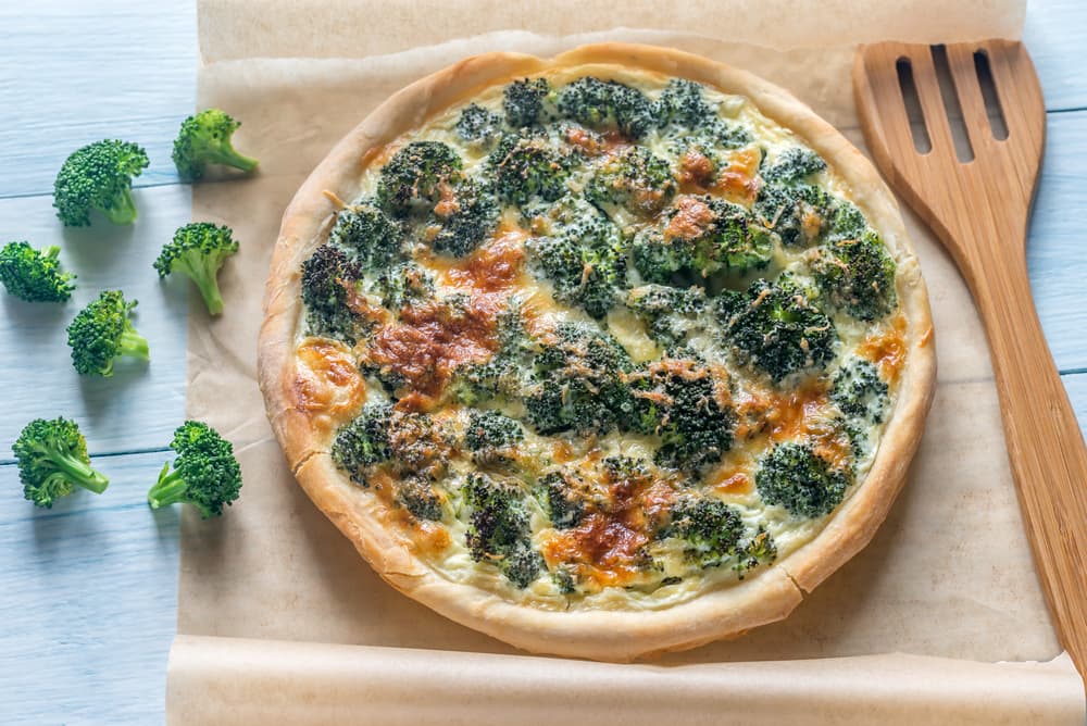 Herví el brócoli y hacé un frito de cebolla. Cuando esté todo listo, mezclá todos los ingredientes y colocálos sobre la masa.