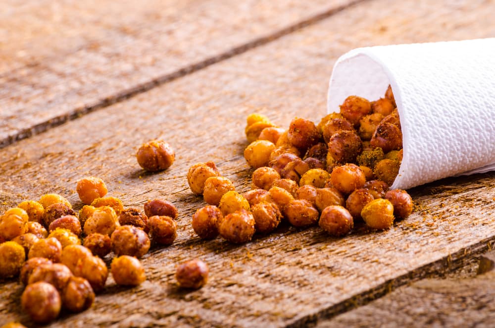 - Precalienta el horno a temperatura media y mezcla los garbanzos con aceite de oliva y los condimentos. Colócalos luego sobre una fuente o placa apta para horno.
