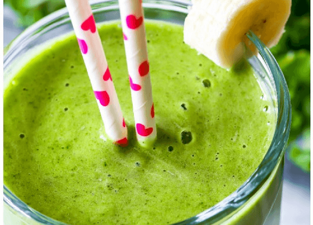 Combina 1/2 taza de leche de coco, 2 tazas de col rizada sin tallo o de espinaca picada, 1 y 1/2 taza de piña y un plátano maduro picado.