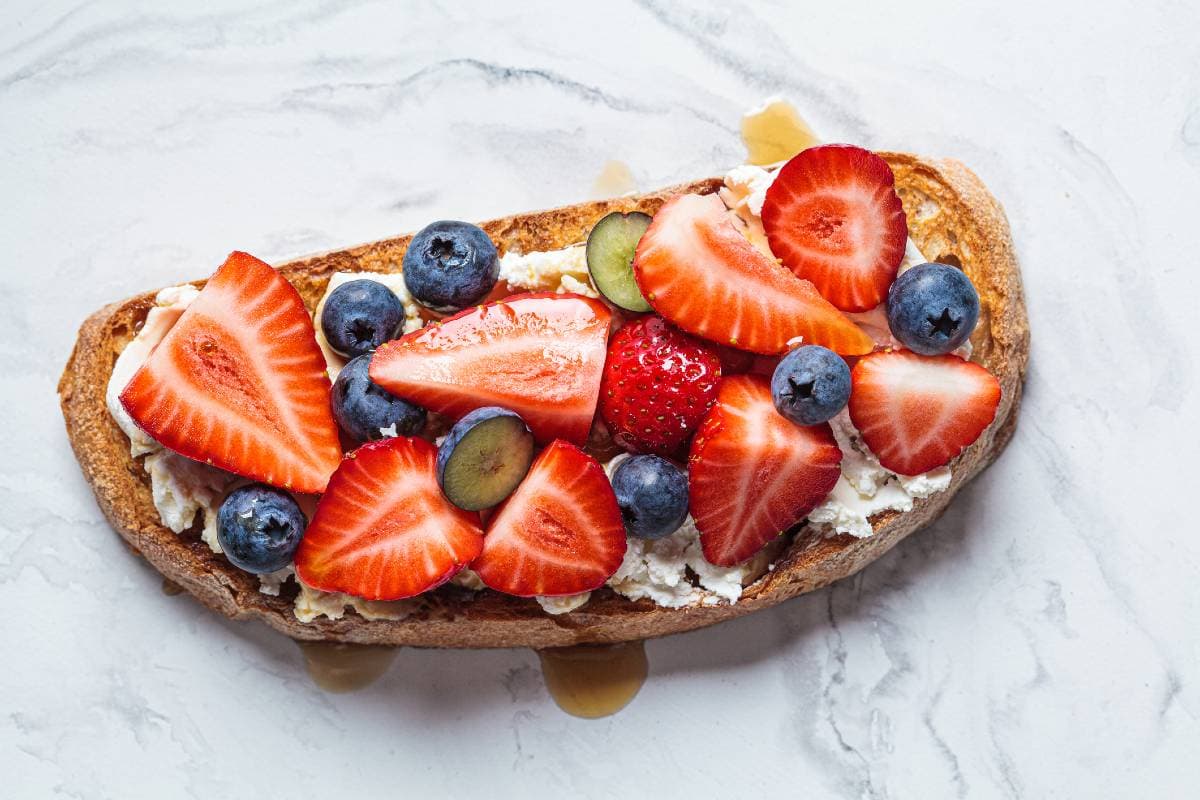 - Coloca queso ricotta en cada pieza de pan y decora con los frutos rojos.