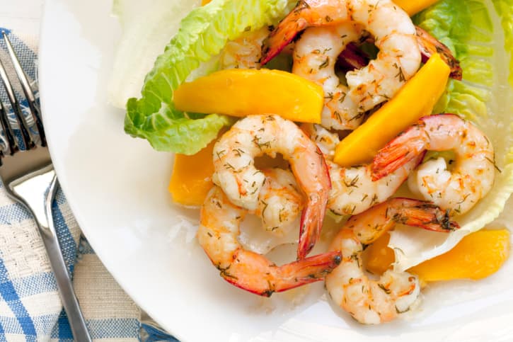 En un tazón mezcla 1/4 taza de chutney de mango con 1/2 cucharadita de ralladura de limón y 2 cucharadas de jugo de limón fresco. Añádelo a 500 gramos de camarones, 1 mango cortado en dados, y 1/4 taza de menta fresca picada.
