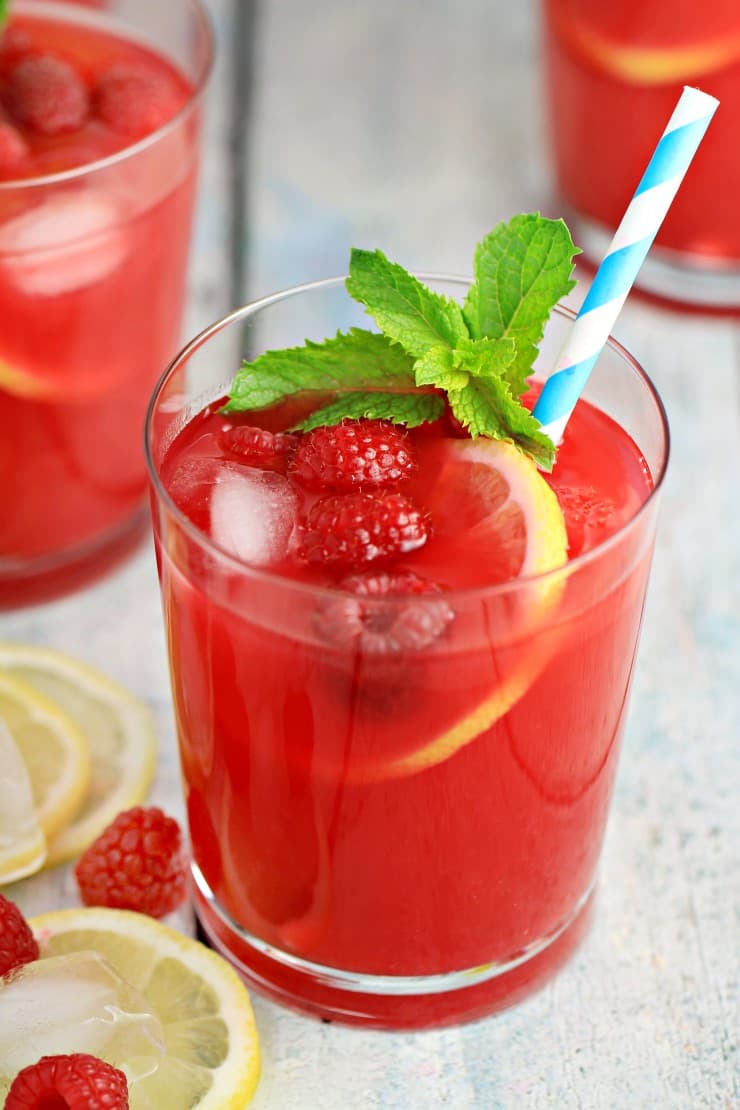 Sirve en vasos con hielo, y decora con frambuesas y hojas de menta.
