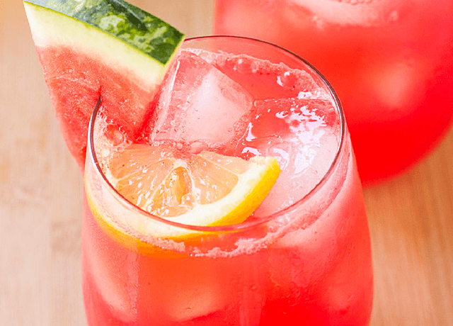 Coloca 8 tazas de sandía en cubos en la licuadora, tritúralos y agrega 3 tazas de limonada y 4 vasos de agua.