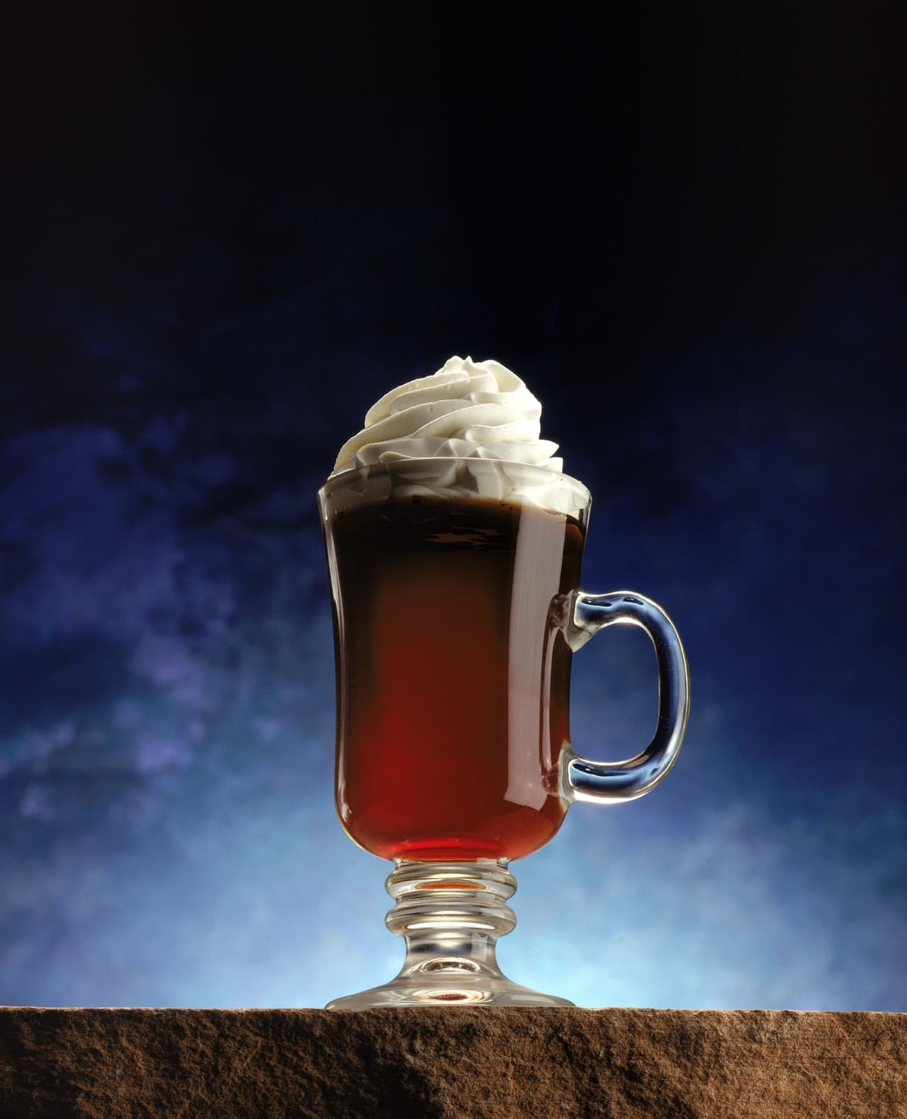 Servir el whisky, el café y el azúcar en una taza templada, revolver y luego colocar una capa de crema previamente batida hasta completar.