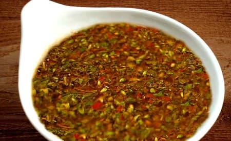 En este caso esta salsa la podrás usar en salchichas o en cualquier tipo de carne ya sea fría o caliente. En un bol mezcla una taza de salsa alioli (mezcla de aceite y ajo), dos cucharadas de cilantro fresco picado y dos de orégano. Añade también ⅓ de taza de hojas frescas de perejil picado, ½ cucharadita de pimentón y una cucharada de jugo de limón. Cuando tengas la mezcla lista guárdala en el refrigerador toda la noche antes de utilizarla.