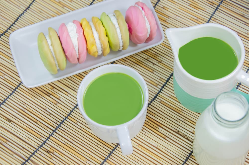 Esta combinación está bien a la moda, ¡y es exquisita! Porque los macarons son tendencia en todos lados, y junto al clásico y suave té verde son una bomba.