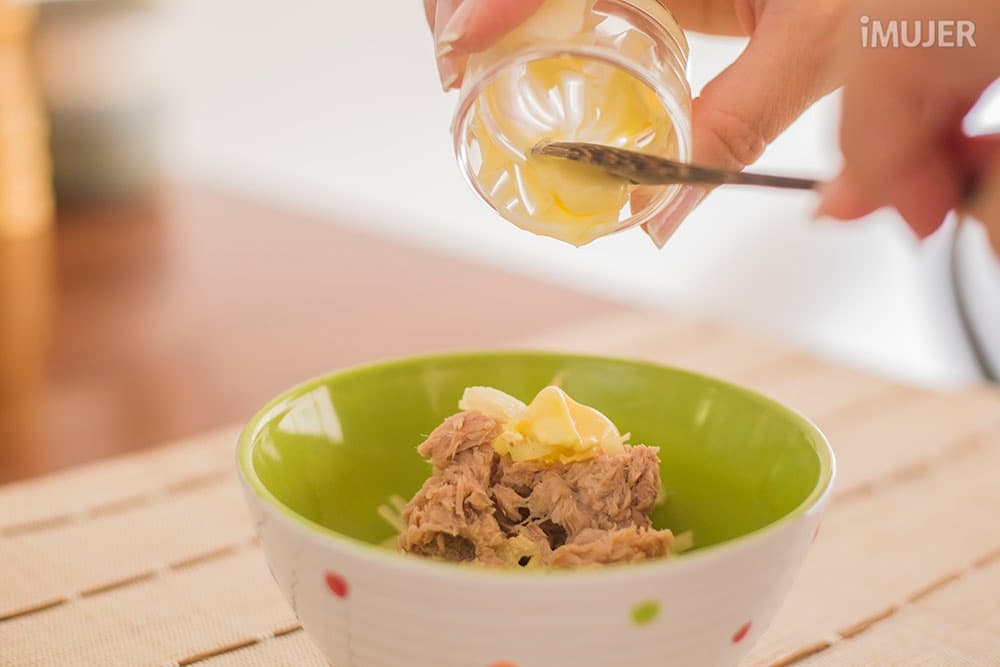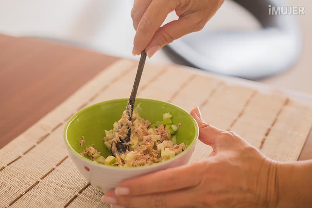 Mezcla en un bol con el atún. Agrega el vinagre y el apio picado.