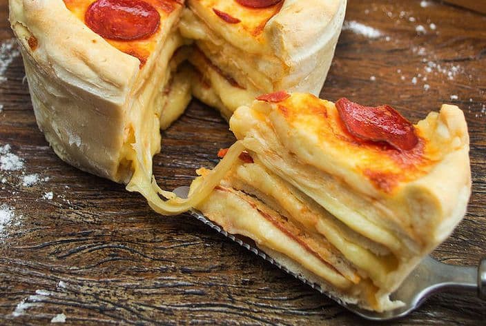 No hay nada mejor para levantar el ánimo que una deliciosa torre de pizza rellena con trozos de muzzarella, pepperoni, aceitunas y jamón.