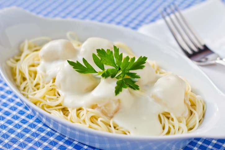 Mientras hierves los tallarines, coloca en una olla pequeña la crema de leche.
