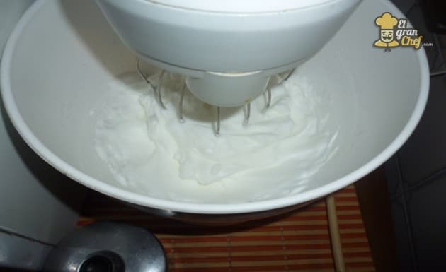 Ponemos a batir en la batidora las claras y esperamos que lleguen al punto nieve (cuando suben y se espuman).