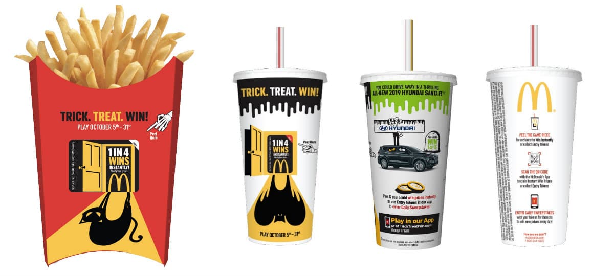 Con Trick. Treat. Win! no necesitas encontrar el trébol de 4 hojas, ¡podrías ganar en la vida real! Tienes 1 en 4 probabilidades de ganar instantáneamente (mayormente premios de comida), pero también podrías obtener otros premios en el App de McDonald's