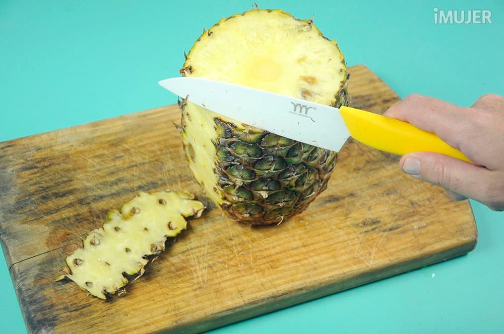 Quita la cáscara a la piña y córtala en rodajas.