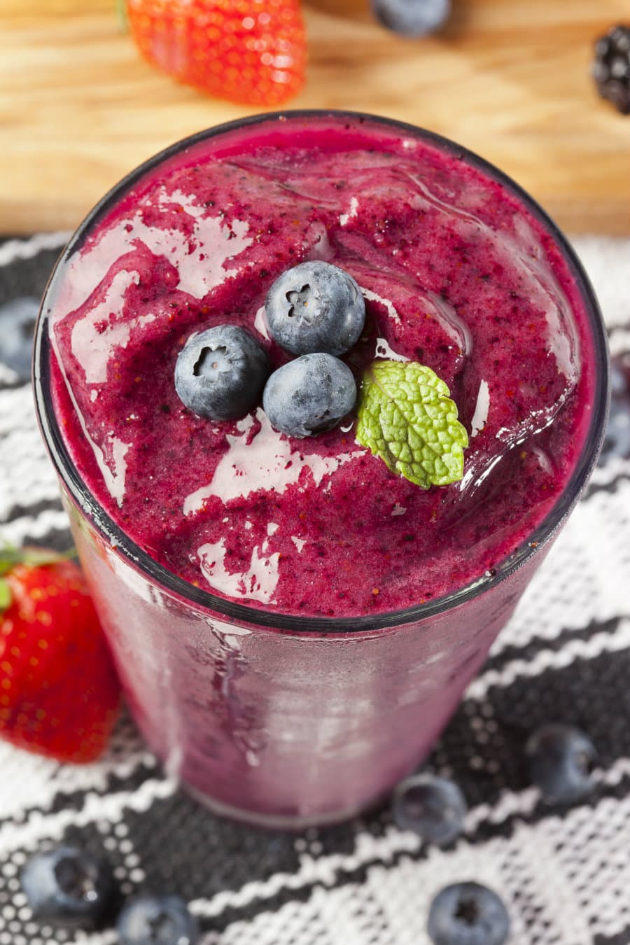 Este batido contiene numerosos ingredientes. El yogurt griego aporta una gran cantidad de calcio y proteínas que ayudan a la pérdida de peso; los arándanos ayudan a disminuir la grasa abdominal; y la piña contiene una enzima que ayuda a facilitar la digestión y eliminar la hinchazón.