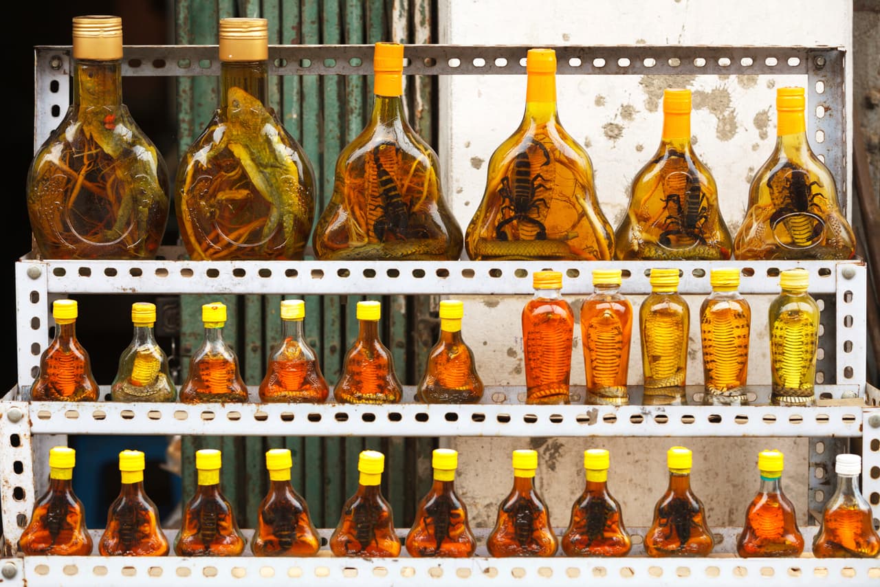 Vino de bebés ratones, mmmm !que rico!, pero no me imagino bebiendo esto. Es vino elaborado con ratones recién nacidos (ahogados y embotellados en vino de arroz antes de que las crezca la piel). Se cree que esta mezcla cura muchos males, pero, no sé si es peor la cura que la enfermedad.
