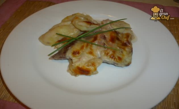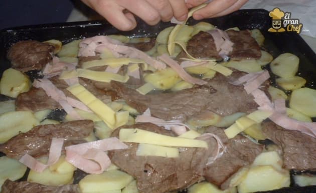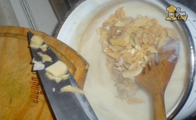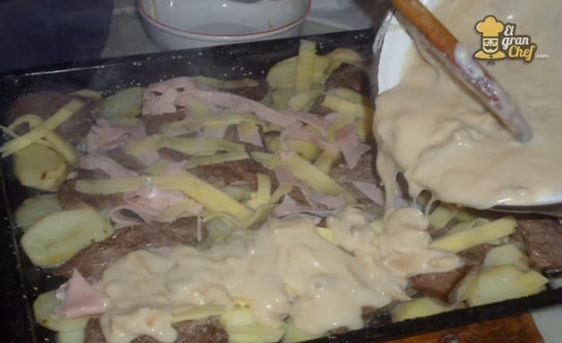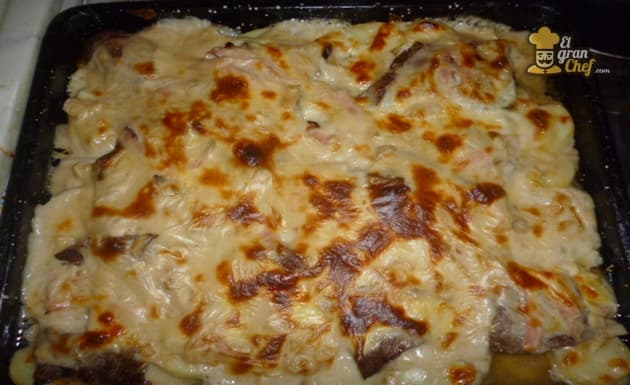 Al terminar esta salsa, nos fijamos en la preparación que tenemos en el horno, es importante que la carne esté cocida y las papas casi tiernas. Al sacarla del horno le agregamos el queso, el jamón y por último la salsa de hongos por encima.