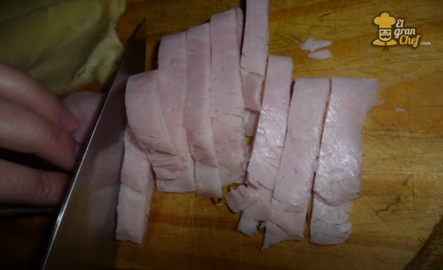 Mientras esperamos que se cocine la preparación del horno, vamos cortando el jamón y el queso en tiras.