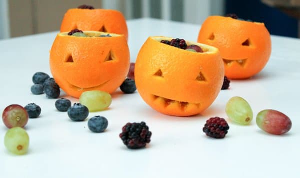 Si tampoco conseguiste calabazas de plástico, o simplemente quieres probar algo más original (y sano), puedes utilizar las cáscaras de naranja como recipientes para colocar pequeñas frutas como uvas, frambuesas, moras, etc.