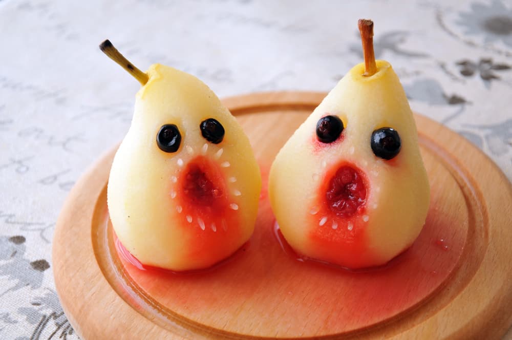 ¡Las peras más terrórificas de todas! Unos arándanos, un poco de jalea, ¡y voilà! Ya tienes el mejor snack para la noche.