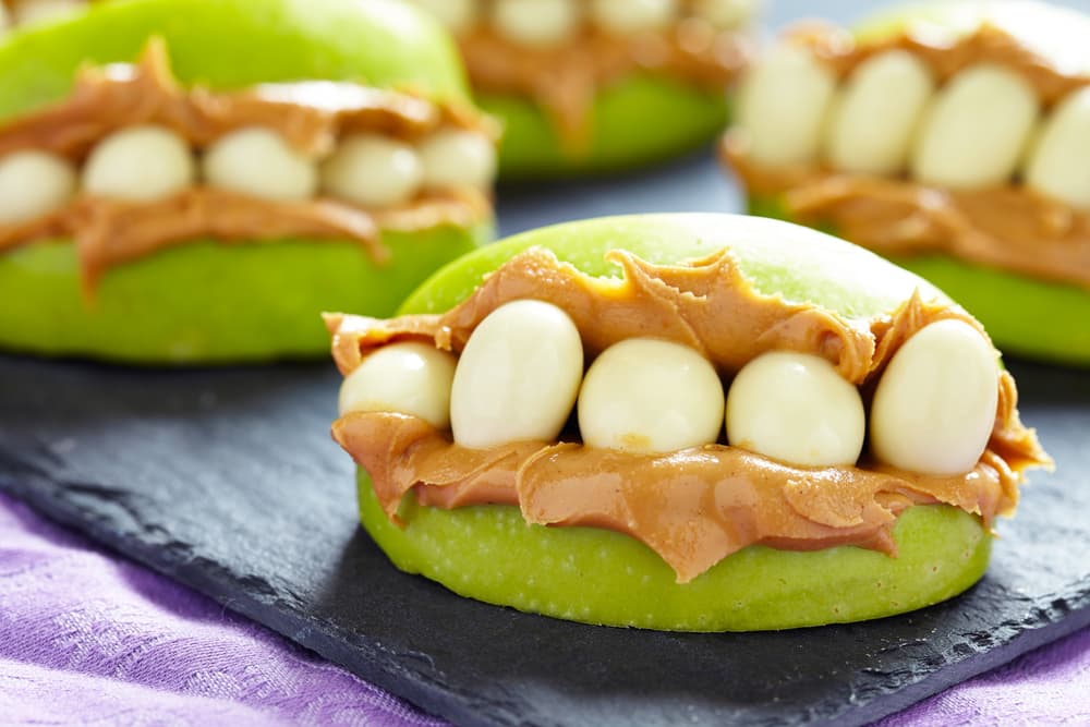¡Bocas de monstruo! Necesitarás cortar dos rodajas de manzana, untarlas con mantequilla de maní y colocar maníes o almendras de forma tal que parezcan dientes.