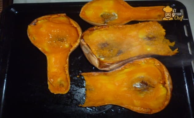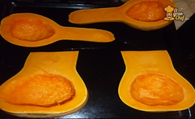 La cáscara la reservamos en la fuente para horno, ya que después la vamos a usar como recipiente.