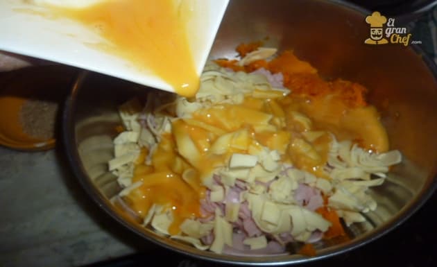 Una vez que la pulpa está fría, agregamos el jamón, el queso y los huevos. Salpimentamos a gusto.