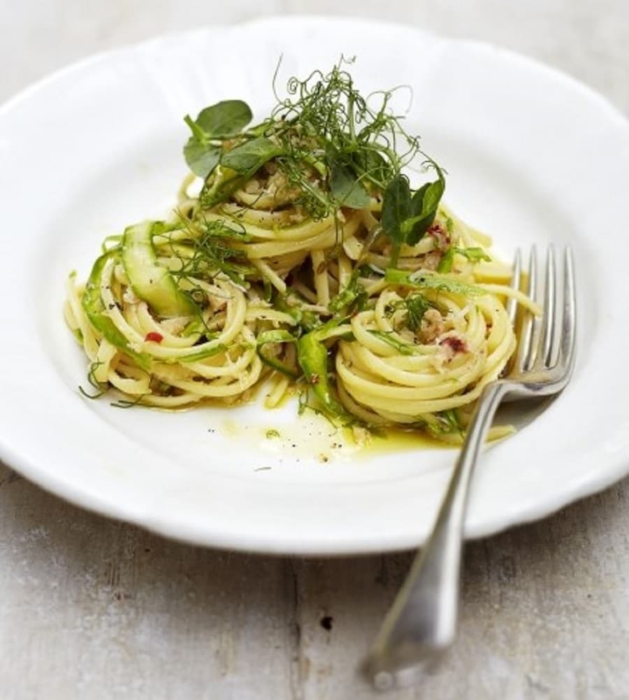Para que consientas a tu familia con un platillo gourmet, el chef Jamie Oliver comparte su receta para preparar un delicioso linguini con espárragos y cangrejo. Un platillo que contiene sólo 333 calorías por porción y es muy fácil de preparar.
