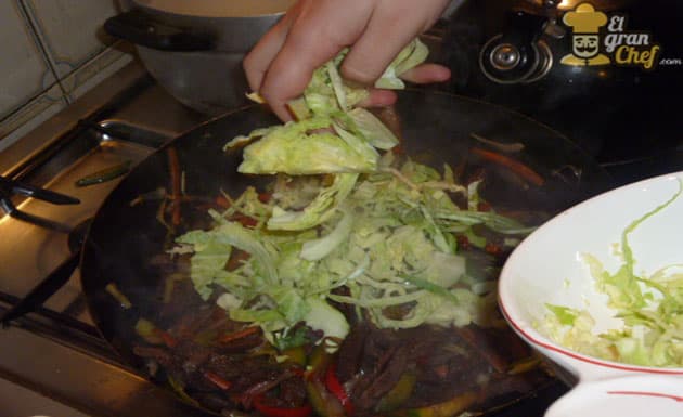 Agregamos los vegetales, menos el repollo ya que éste es muy blando y no queremos que se nos cocinen demasiado las verduras.