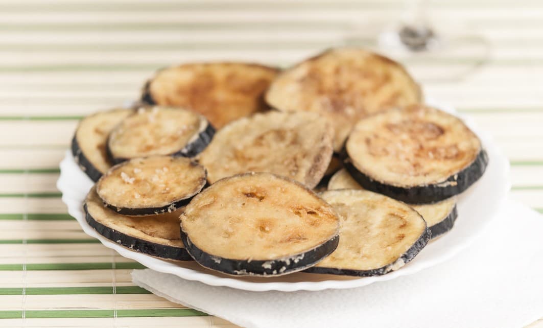 En un plato mezcla 1/2 cucharada de harina con 1 cucharadita de sal. Calentar 2 cucharadas de aceite de oliva en una sartén grande a fuego medio-alto. Cuando el aceite esté caliente, pasa las rodajas de berenjena por la harina y sacude el exceso. Coloca suavemente las berenjenas enharinadas en la sartén, friendo durante 2 minutos por cada lado. Retira y coloca en un plato cubierto con toallas de papel para eliminar el exceso de aceite.