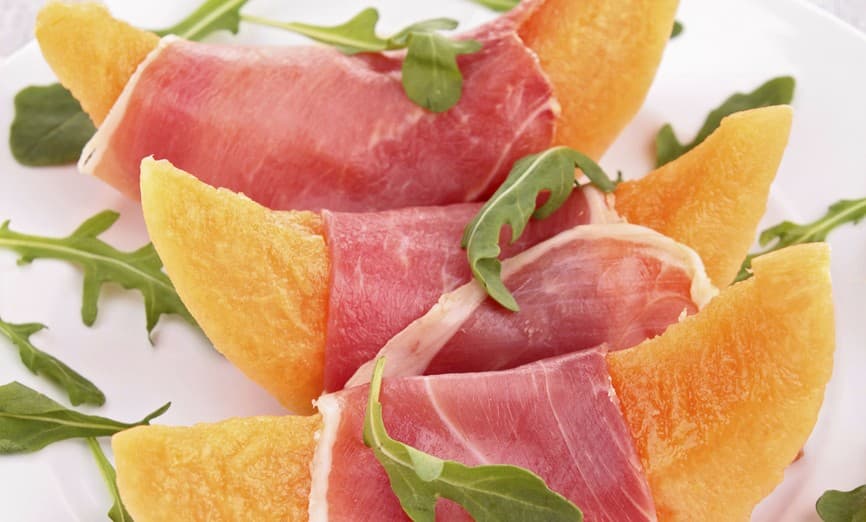 Es extraño, pero hay algo en la dulce jugosidad del melón que se mezcla maravillosamente con el sabor salado del jamón. Ideado por los italianos, el melón y jamón crudo se ha extendido por todas partes como un aperitivo de verano maravillosamente extraño. ¡También puedes añadir mozzarella a esta combinación para que quede aún mejor!