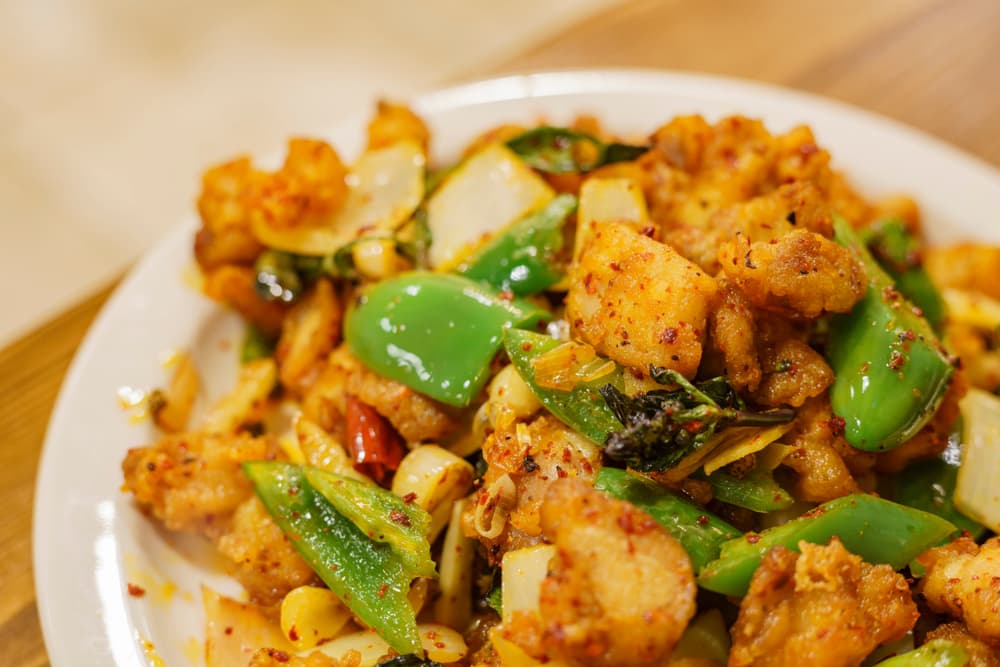 Pollo, vegetales y un gusto de lo más explosivo. No lo decimos sólo por el picante, sino porque contiene una combinación de sabores interesantes. Lo notarás en los toques dulces que también brotan del platillo. Para que el pollo quede aún más sabroso, es conveniente marinar el pollo antes con especias. Además del chile originario de Szechwan, los vegetales que suele llevar son cebollas, pimientos, ajo, jengibre y nueces.