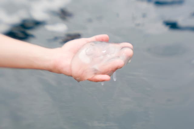 Una vez que la hayas cocinado y la medusa se haya encogido, retirarla del agua caliente y deja que escurra en un colador un par de minutos, luego llévala a un recipiente con agua fría.