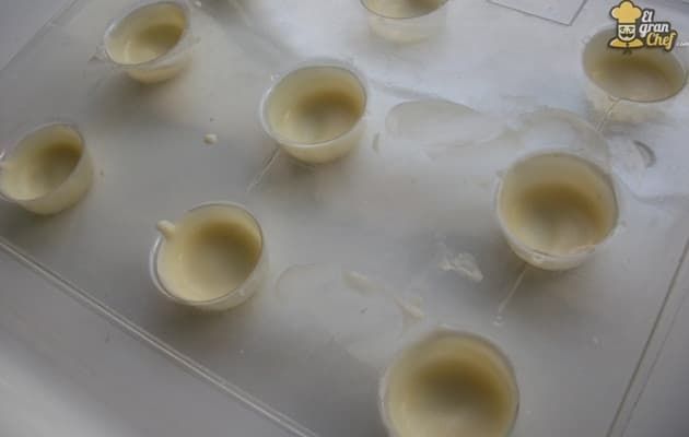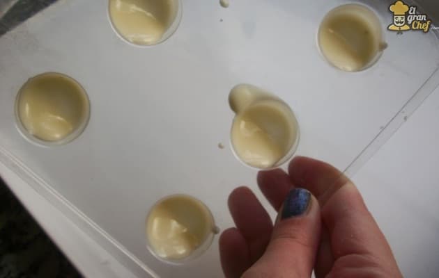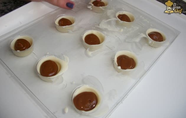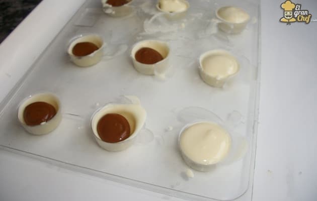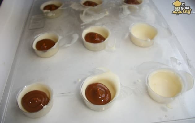 Además en el caso del chocolate blanco, ayudamos a crear una capa más gruesa para que no se delate el relleno de su interior. ¡¡OJO!! Que no se seque demasiado el chocolate entre una capa y otra porque, si lo secas completamente, no se adherirá la segunda ronda.