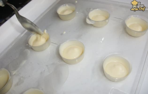 Colocamos una pequeña cantidad de chocolate en cada hueco del molde. Es súper importante tener en cuenta que para hacer bombones rellenos, los moldes a utilizar deben ser profundos para poder rellenarlos cómodamente sin que el relleno se salga por todos lados.