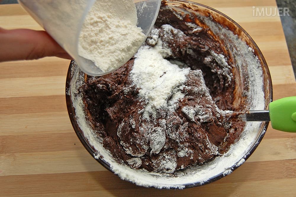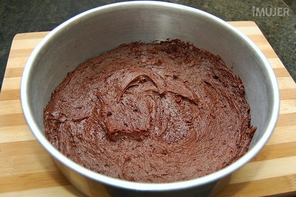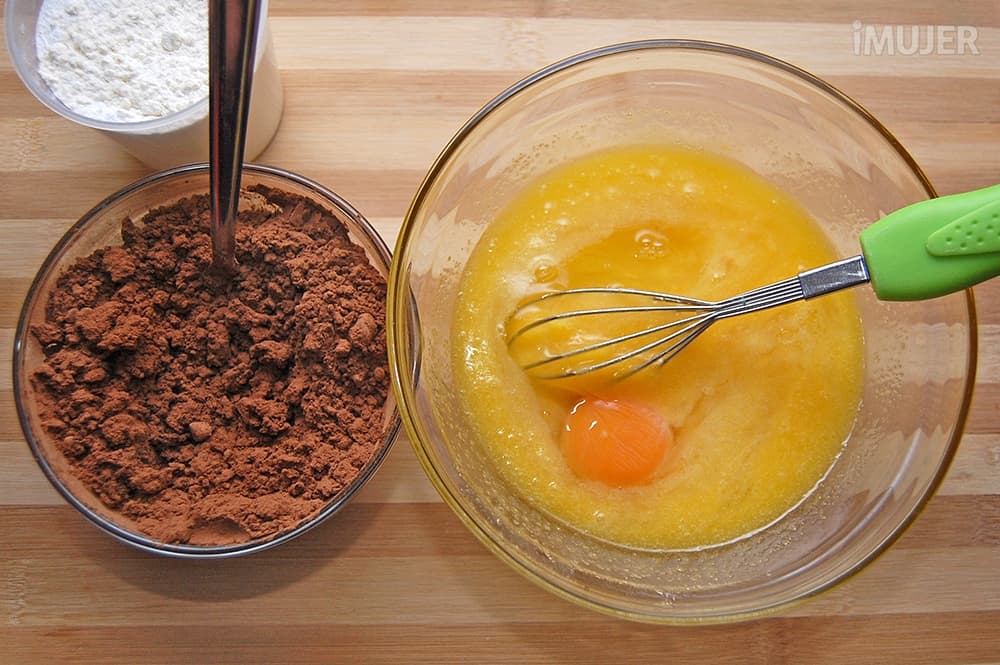 Agrega los huevos de a uno batiendo cada vez e incorpora el cacao disuelto en un poco de agua. Finalmente incorpora la harina leudante.