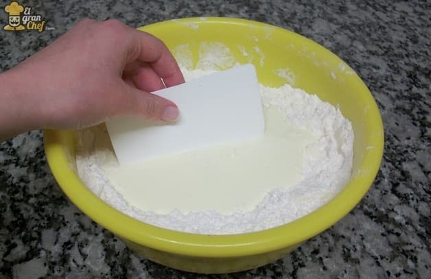 En un hueco, volcamos la crema/nata, el huevo y la leche. Con el cornet seguimos integrando todos los ingredientes hasta que apenas se unan. En el caso de los scones, no necesitamos formar una masa sino solo lograr que los ingredientes se unan.