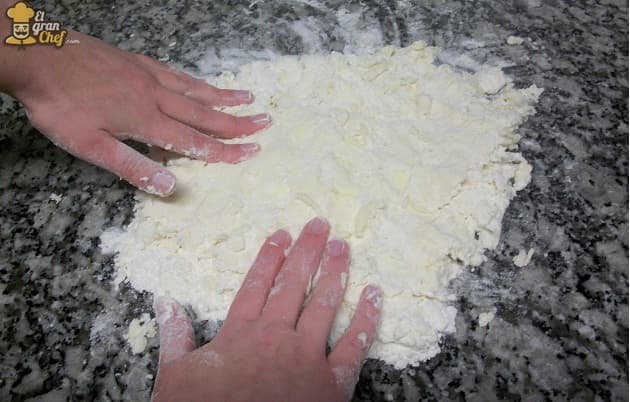 Volcamos la mezcla a la mesada y estiramos con los dedos. Debe quedar de un grosor de aproximadamente 1, 5 - 2 cm, es decir, alta.