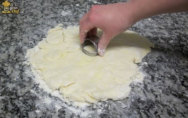 Con un cortante de 4 cm de diámetro, cortaremos los escones. Con la masa que sobre, sin tocarla mucho, volvemos a unirla para volver a estirarla y cortar nuevamente.