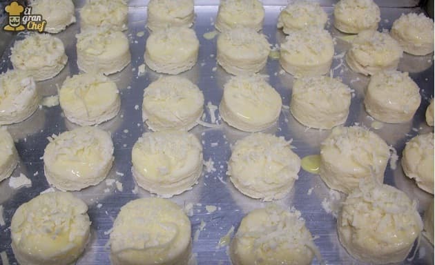 Disponemos los escons en una placa, con un poquito de distancia entre sí para que no se peguen al cocinarse (ya que al tener polvo de hornear, su volumen crecerá). Los pincelamos con el huevo batido y los espolvoreamos con queso rallado.