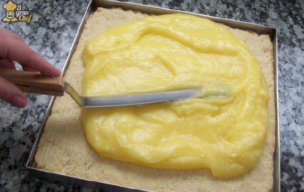 Dejamos enfriar apenas y colocamos sobre la masa cocida.